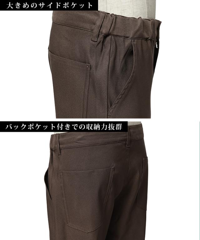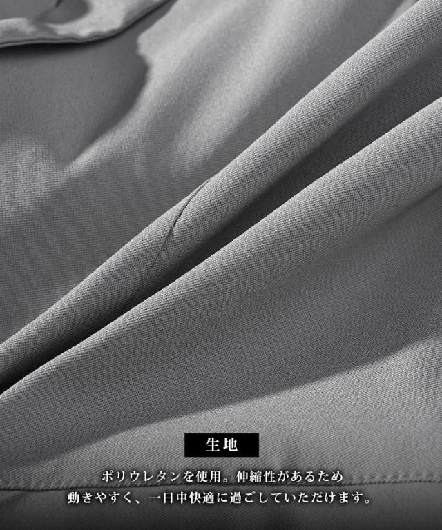 ジャケットの肩幅と身幅、ウエスト周りはピッタリとフィット感がありますが、伸縮性があるのでしんどくはないです。着丈はお尻が隠れる長さで、袖丈は手の甲が半分隠れる長さです。パンツのウエストは手の平が入るくらい余裕があります。ヒップから太ももと、ふくらはぎ部分はひとつまみできるくらい余裕があります。丈はかかとが隠れて、少し溜まりができますね。