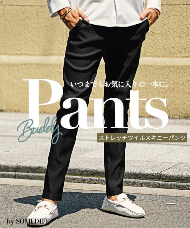 SOMEDIFF(サムディフ)『前開きツイルスキニーパンツ』【前開きツイルスキニーパンツ】■Design / デザインスリムながらも程よい余裕を残したシルエットで、脚のラインをすっきり見せつつ動きやすさも兼備。前開きはジップ仕様で着脱しやすく、デイリーに使いやすい設計です。サイドは大きめポケットを配置し、実用性とデザイン性を両立。さらにバックには2つのポケットを備え、後ろ姿まで抜かりなく仕上げています。シンプルな見た目ながらカジュアルからキレイめまで幅広いスタイルに馴染み、トップスやシューズを選ばない万能さが魅力。ブラックやホワイトをはじめとした5色の豊富なカラーバリエーションで、毎日の着こなしに取り入れやすい一本です。