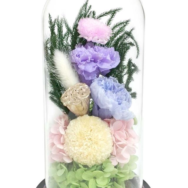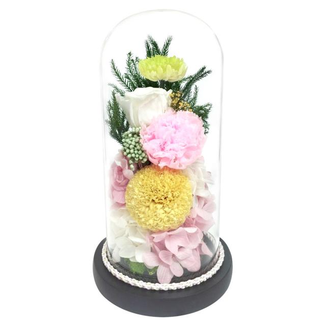 すっきりとした上品なガラスドームに包まれた、お供え用のプリザーブドフラワーアレンジメントです。高さ約21.5cmのロングタイプで、お仏壇に置くと空間がより華やかに彩られます。
