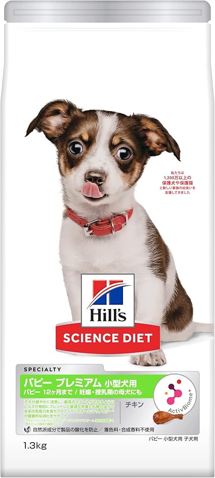 ヒルズ独自のプレバイオティクスブレンド(アクティブバイオームテクノロジー)が子犬の健やかな腸内環境と消化をサポート, アクティブバイオームテクノロジー*が速やかに健康な排便をサポート, お試しにもおすすめ, 12ヶ月までのトイプードル、チワワ、ミニチュアダックスフンド、 ポメラニアン、 ヨークシャー・テリア、 ミニチュア・シュナウザー、 シー・ズー、 パピヨンといった小型犬および妊娠・授乳期の母犬に対応 原材料 トリ肉(チキン、ターキー)、トウモロコシ、小麦、チキンエキス、玄米、コーングルテン、大麦、オート麦、ピーカンナッツ殻パウダー、亜麻仁、ビートパルプ。柑橘類、クランベリー、植物性油脂、動物性油脂、ミネラル類(カルシウム、ナトリウム、カリウム、クロライド、マグネシウム、銅、鉄、マンガン、セレン、亜鉛、ヨウ素)、乳酸、ビタミン類(A、B1、B2、B6、B12、C、D3、E、ナイアシン、パントテン酸、葉酸、ビオチン、コリン)、アミノ酸類(タウリン、スレオニン、トリプトファン)、酸化防止剤(ミックストコフェロール、ローズマリー抽出物、緑茶抽出物) 52742052915
