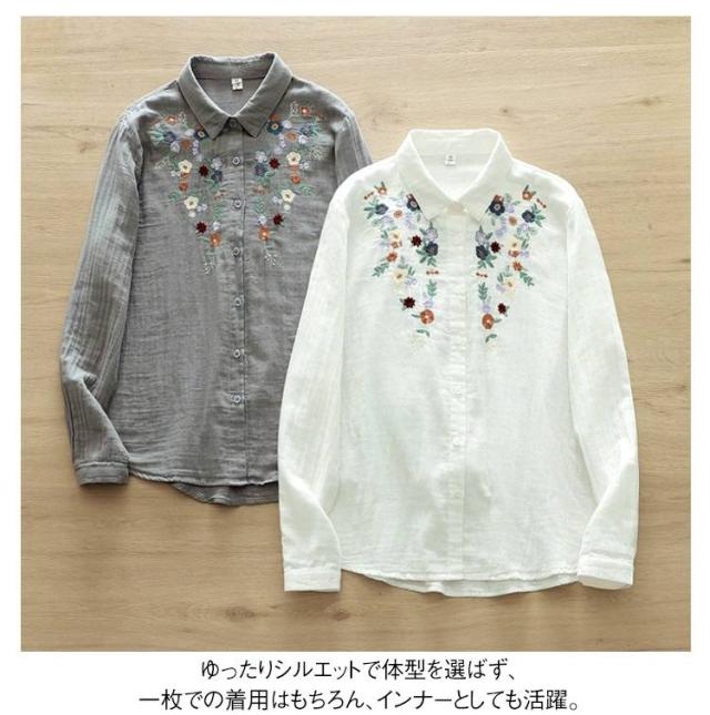 コットンシャツ ダブルガーゼ ダブルガーゼ 花柄 レディース ガーゼシャツ 刺繍 ナチュラル 可愛い ブラウス 刺繍シャツ シャツ トップス 長袖 森ガール ゆったり 春服 秋服