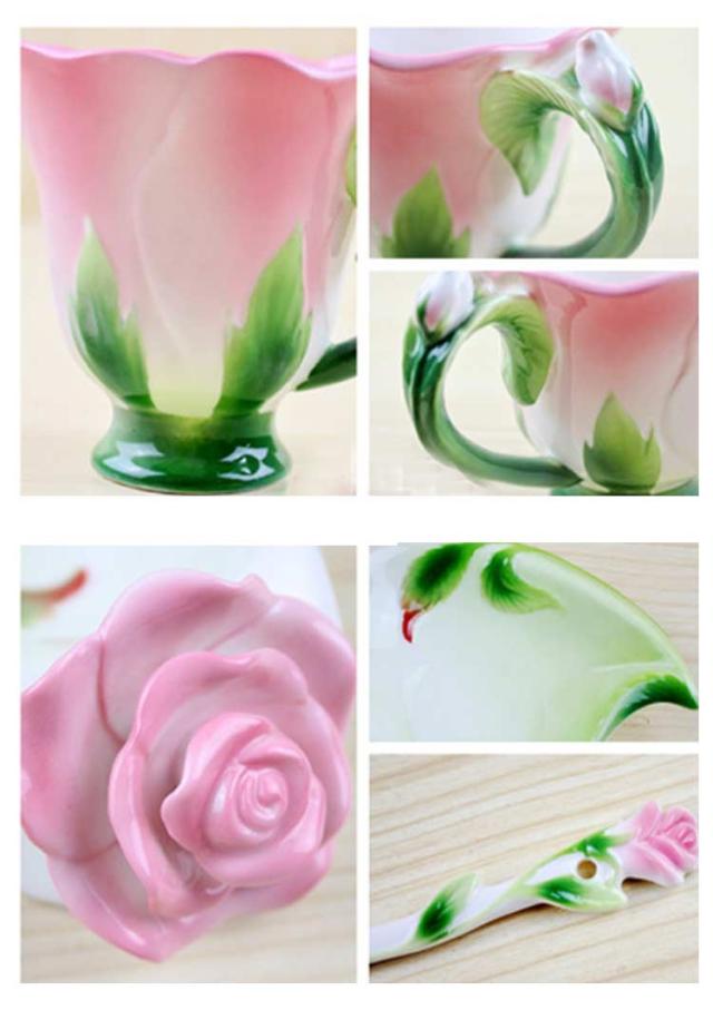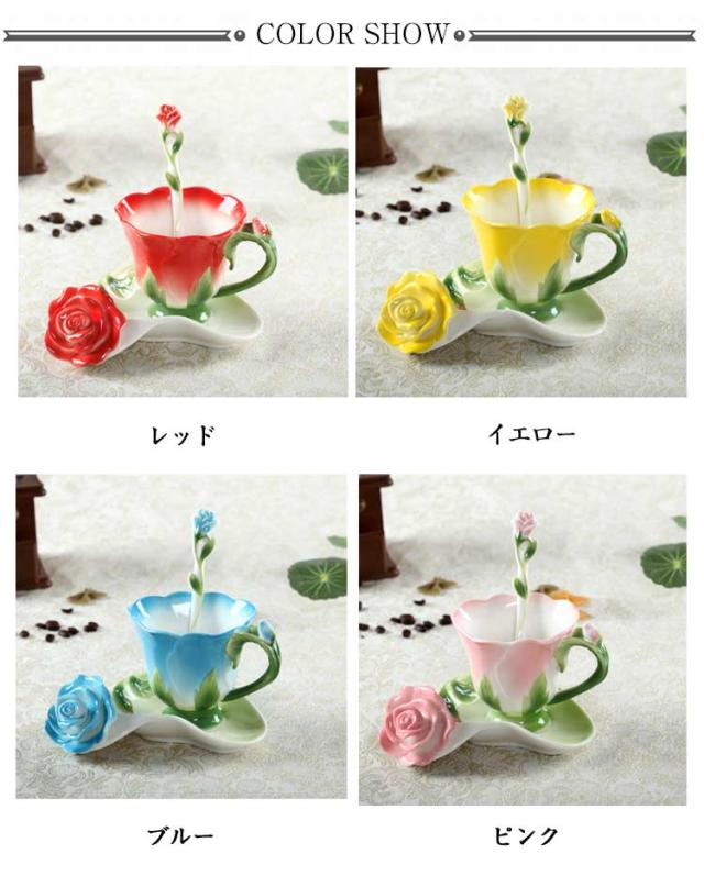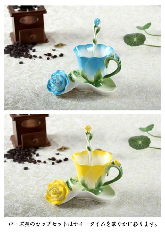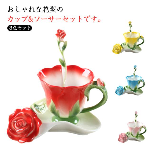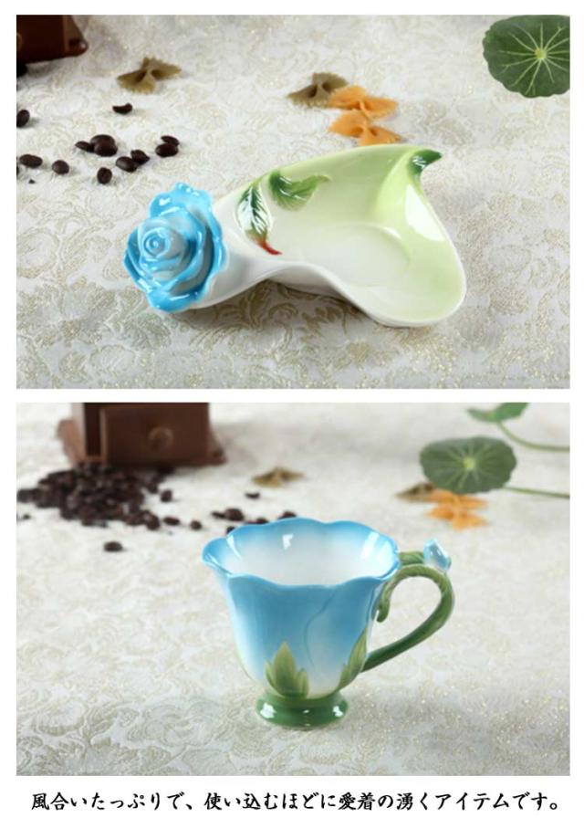 ソーサー 200ml 3点セット コップ 皿付き 彫刻 陶器 カップ マグカップ 耐熱 型 マグカップ コーヒーカップ 取手付き かわいい 湯呑み スプーン付き 花模様 花柄 ローズ 華奢 セット コーヒー ティー お茶 花型 母の日 敬老の日 誕生日 ギフト プレゼント