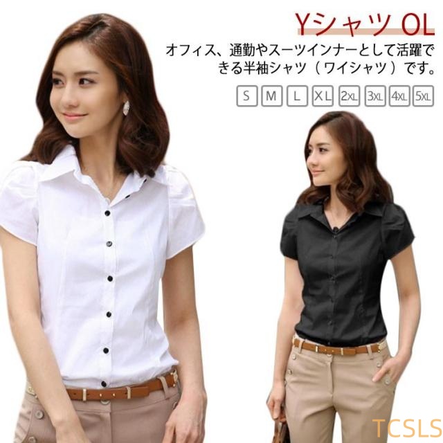 フレア ビジネス ワイシャツ オフィス フォーマル 事務服 ブラウス カジュアル 通勤 レディース チューリップ袖 パフスリーブ シャツ OL 白シャツ 半袖 シャツ Yシャツ 制服 無地 トップス パフ袖 襟付き 大きいサイズ 春 夏 秋 ホワイト ブラック