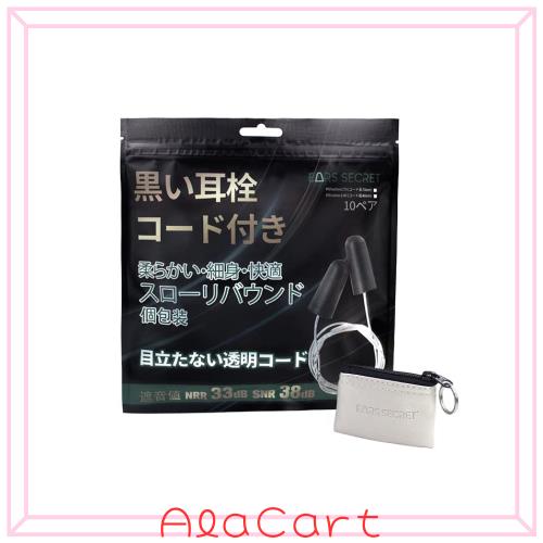 EARS SECRET 黒い 耳栓 紐付き 透明 コード付き 70cm 個別包装 細身 ANSI適合品 NRR値 33dB ブラック ソフトフォーム ノイズキャンセリン