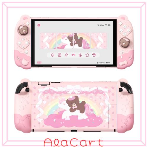 癒し系の可愛いデザイン:ユニコーンの上に寝そべるくまちゃんと、背景に広がる虹色の夢のような空が、魔法のように優しく癒してくれるデザインです。くま耳のアクセント、星や雲モチーフのボタン、くまテーマのスティックカバーも付属しており、細部までとことん可愛らしさにこだわっています。Switch2にピッタリ。
