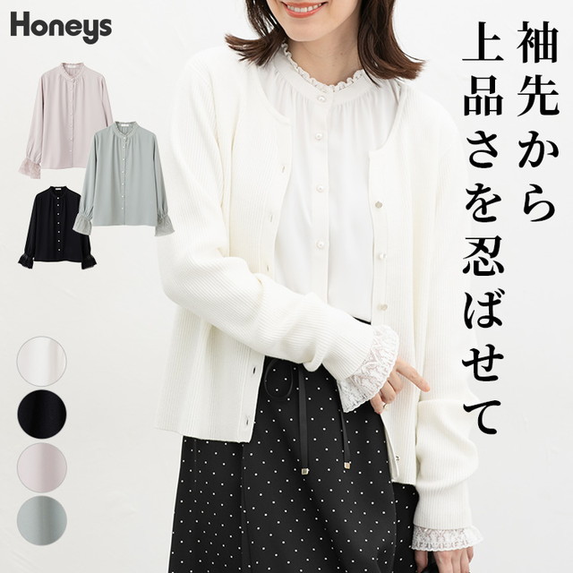 トップス ブラウス 長袖 オフィス きれいめ レース 袖口ゴム ジョーゼット素材 フロントボタン 無地 レディース Honeys ハニーズ 袖口レースブラウス