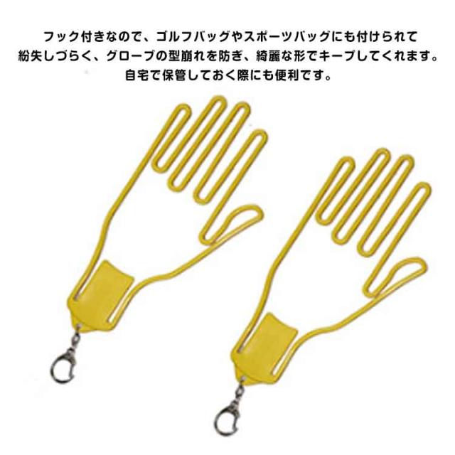 | 汗や雨で濡れたグローブをグローブハンガーに装着することで シワにならず乾かすことができます。 フック付きなので、ゴルフバッグやスポーツバッグにも付けられて 紛失しづらく、グローブの型崩れを防ぎ、綺麗な形でキープしてくれます。 自宅で保管しておく際にも便利です。 ゴルフグローブだけでなく、様々なグローブで使用できるので プレゼントやゴルフコンペの景品としてもオススメです。 | |