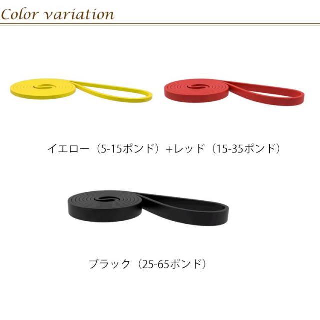 | サイズについての説明 | 厚さ:4.5mm 幅:イエロー(6.4mm)、レッド(13mm)、ブラック(22mm) おすすめ強度:イエロー(2.2-6.8kg)、レッド(6.8-15.8kg)、ブラック(11.3-29.4kg) |