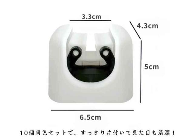 | 掃除道具をスッキリ収納!穴あけ不要 超お得10個セット 壁に取り付けるだけで、モップやほうき、クイックルワイパーを簡単に整理できる便利なモップホルダーです。 モップやほうきを壁掛けできるので床がスッキリ、毎日の掃除をもっと快適に、収納スペースを有効活用できます。 弾性のあるローラー式クリップを採用、ハンドルをしっかり固定、落ちにくい安心設計です。直径5mm〜28mmのハンドルやパイプ類に対応でえきます。 取り付け簡単、粘着テープで壁に貼るだけ、穴あけ不要、女性一人でも手軽に設置できます。 浴室、トイレ、ベランダーなど場所で掃除用具をきれいに整理するのはもちろん、キッチンや玄関に設置して、キッチンツールホルダーや傘ホルダーとしても活躍できます。 10個同色セットで、すっきり片付いて見た目も清潔! | |
