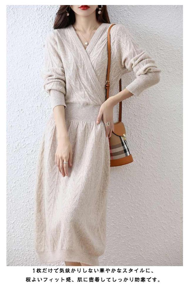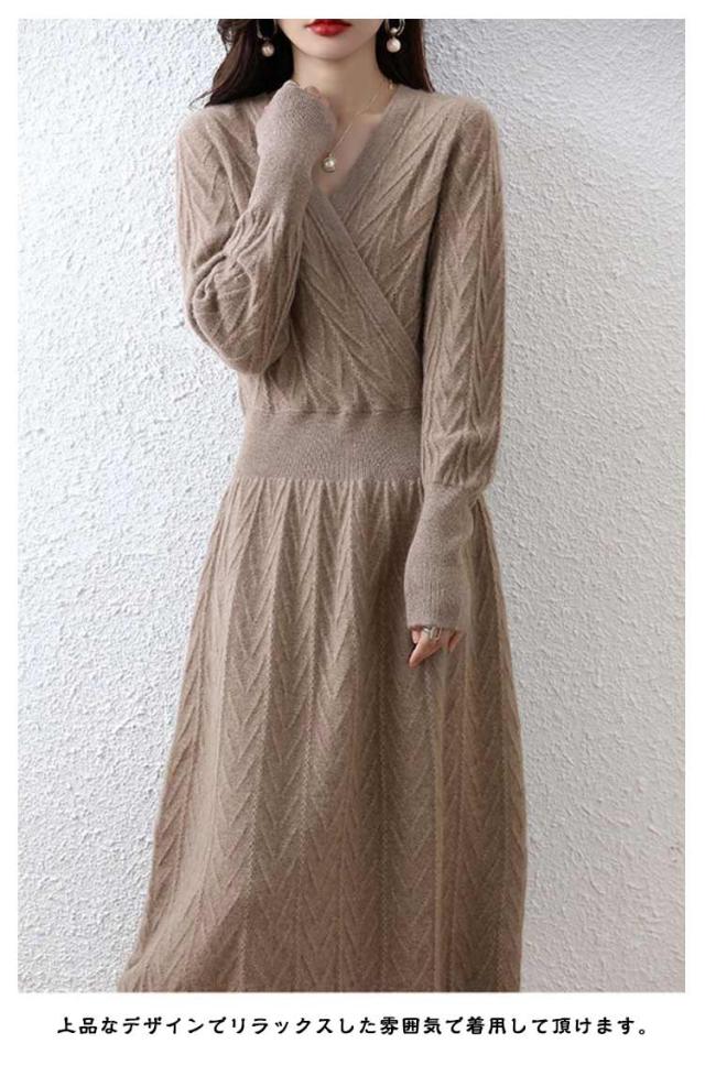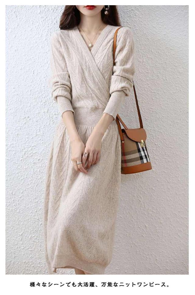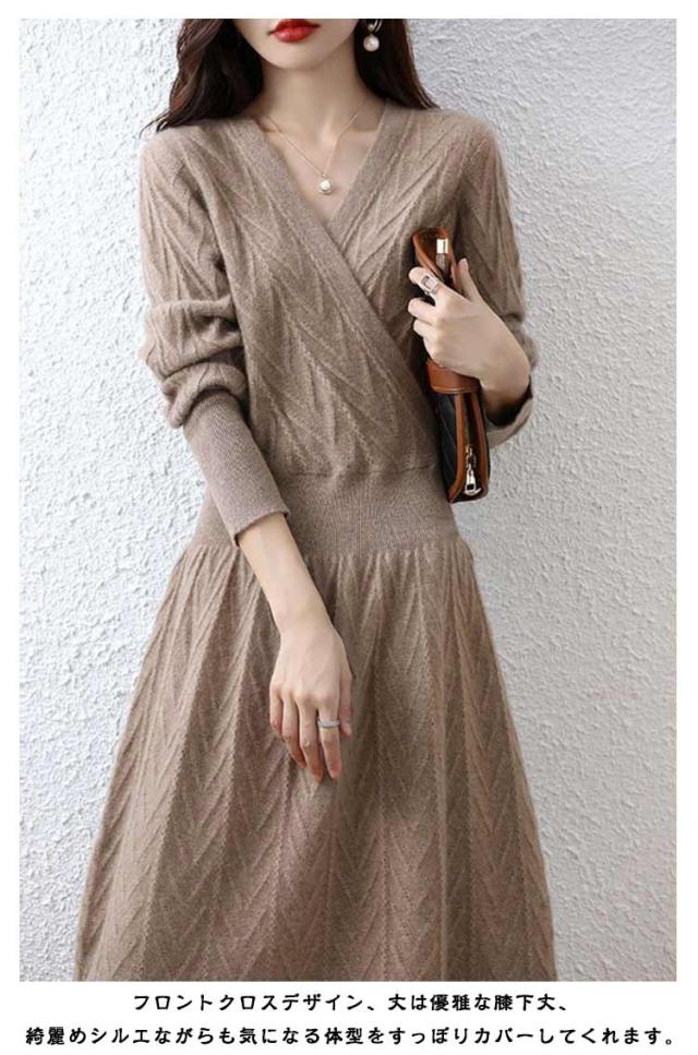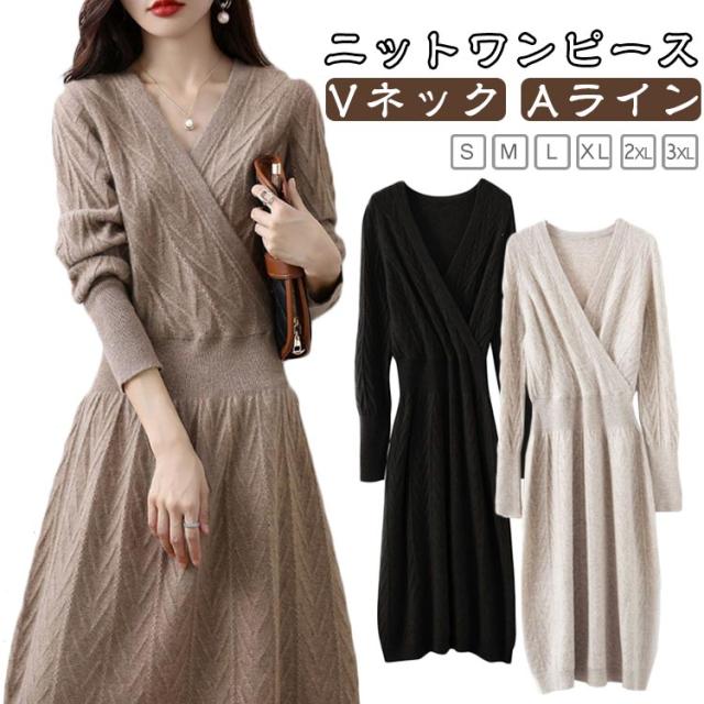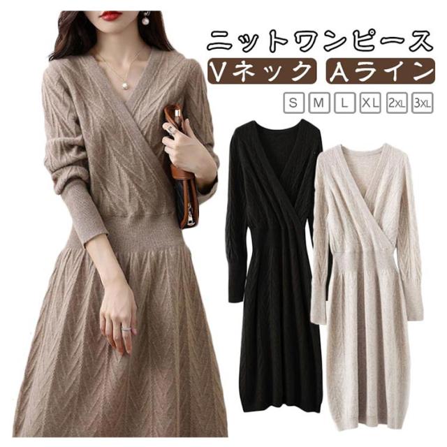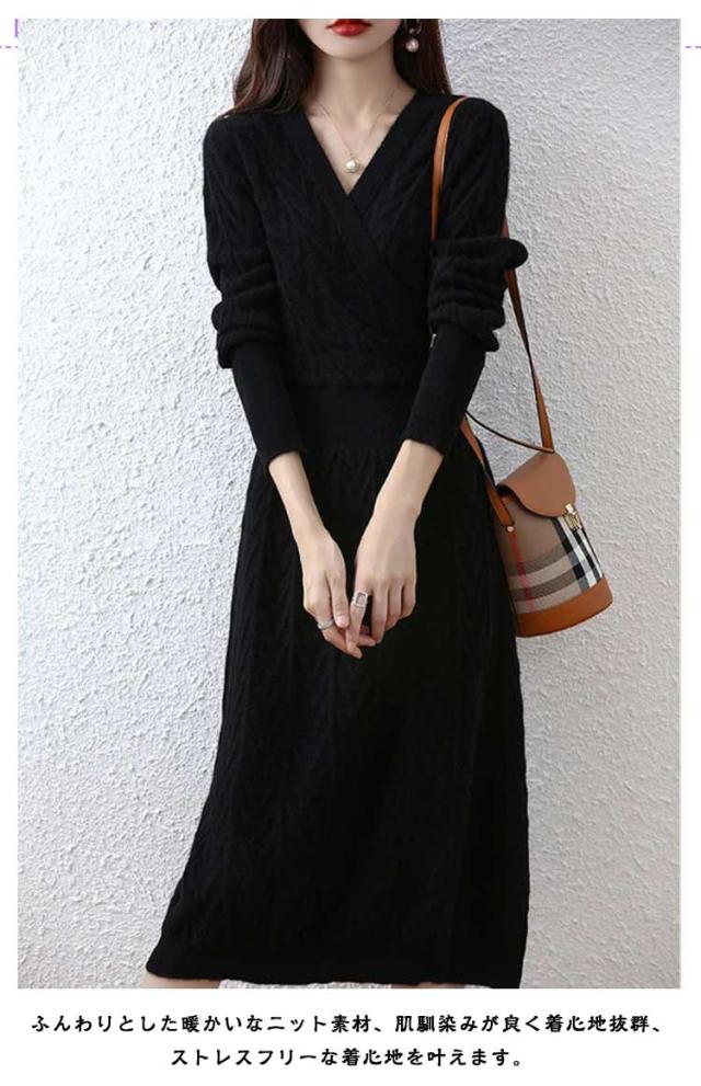 秋 セクシー 姫系ワンピース 長袖 ロングワンピース Vネック ニット Vネック フロントクロス ワンピース お嬢様 上品 二次会 ニットワンピース 韓国ファッション 着?せ S M L XL 2XL 3XL