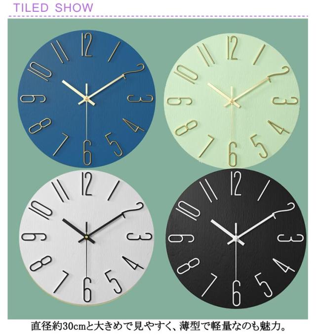 | 直径30cm シンプルなゴールドの針がアクセントになったデザイン。 直径約30cmと大きめで見やすく、薄型で軽量なのも魅力。 キッチンやリビングはもちろん、連続秒針を採用した静音設計のため寝室にも◎。 フレームと風防がなく光を反射しにくいので、場所を選ばず設置できます。 | |