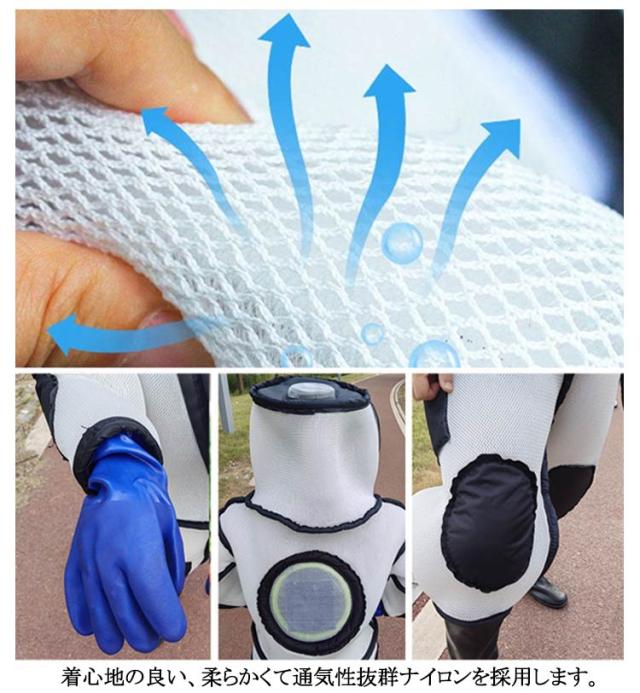 | 【手袋、長靴付き】【通気性が高い扇風機3つ付き、3Dメッシュ構造のスズメバチ駆除用蜂防護服】 扇風機3つ付き:後頭部×1、背中×1、顔の前×1に扇風機が付いています(バッテリーが付きません。市販のバッテリーがすべて使えます。) 着心地の良い、柔らかくて通気性抜群ナイロンを採用します。 肥厚した布は、ハチの咬傷からよりよく保護することができる。 3Dメッシュ構造で軽くて蒸れにくい作りで、超軽量で着心地が良く、自由自在に作業できます。 通気性のあるナイロン素材で扇風機が付属しているため、通気性が高く放熱性に優れています。 | |