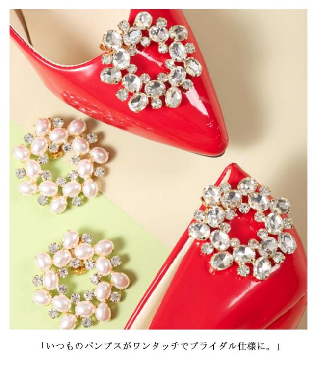 | パンプスにぴったりなワンタッチクリップバックル。 コンパクトなサイズ感のシューズクリップ パールデザインで上品さを演出 無地のパンプスしか持っていない方必見!お手持ちのパンプス/ヒールにワンタッチで簡単装飾♪ 2個セットですので、靴以外にも帽子やクラッチバッグ、ジャケットのドレスアップにも便利です♪ 「いつものパンプスがワンタッチでブライダル仕様に。」 | |