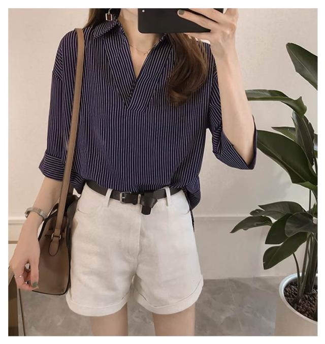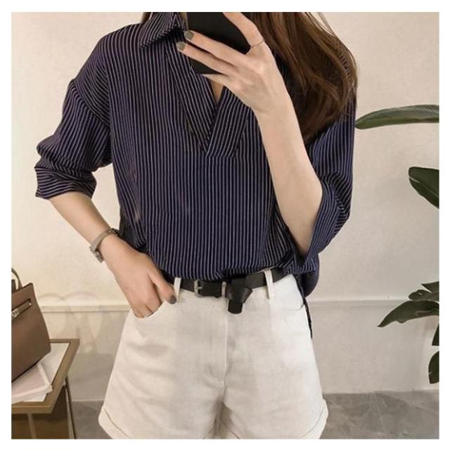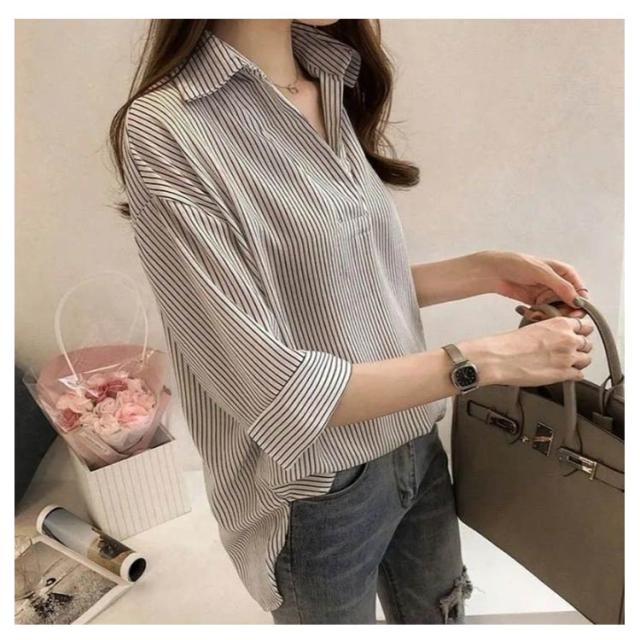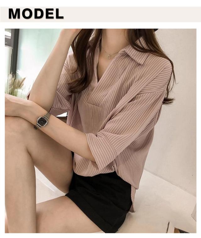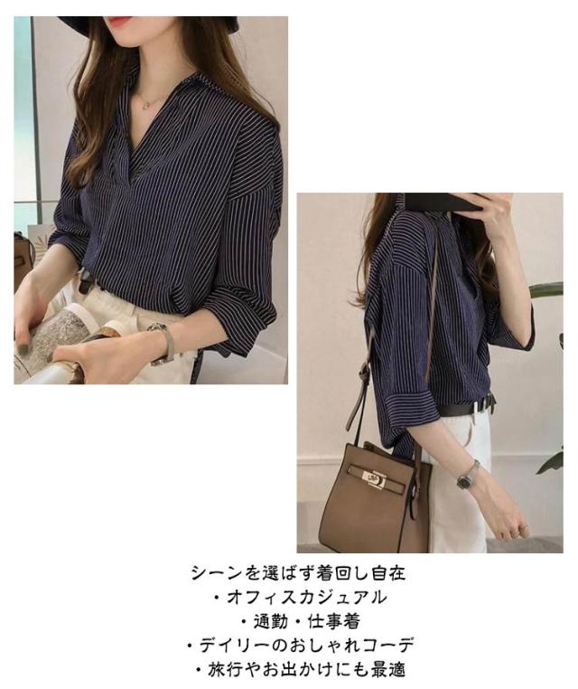 ストライプ レディース スキッパーブラウス シャツ トップス 秋 ブラウス かわいい おしゃれ 七分袖 春 夏 ブラウス 開襟シャツ スキッパー 上品 Vネック ゆったり 体型カバー オフィス カジュアル 白 ブルー ピンク