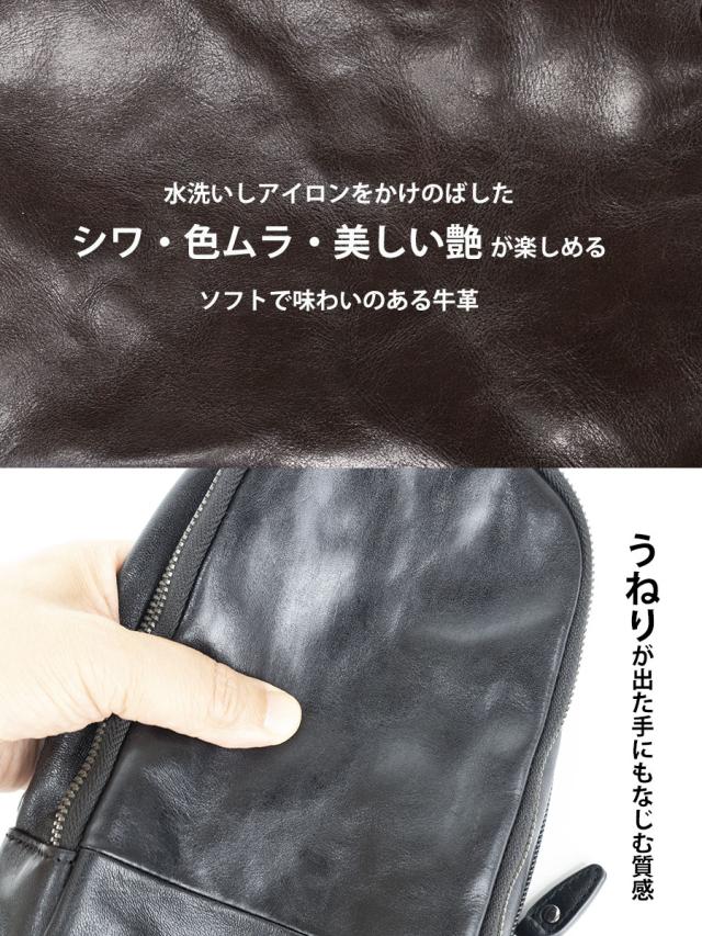 水洗いしアイロンをかけて伸ばした、シワ・色ムラ・美しい艶が楽しめるソフトで味わいのある牛革を使用しています。うねりが出た手にもなじむ軽い仕上がりです。