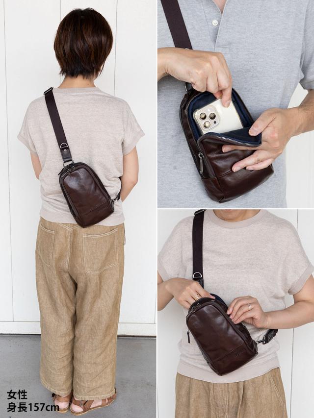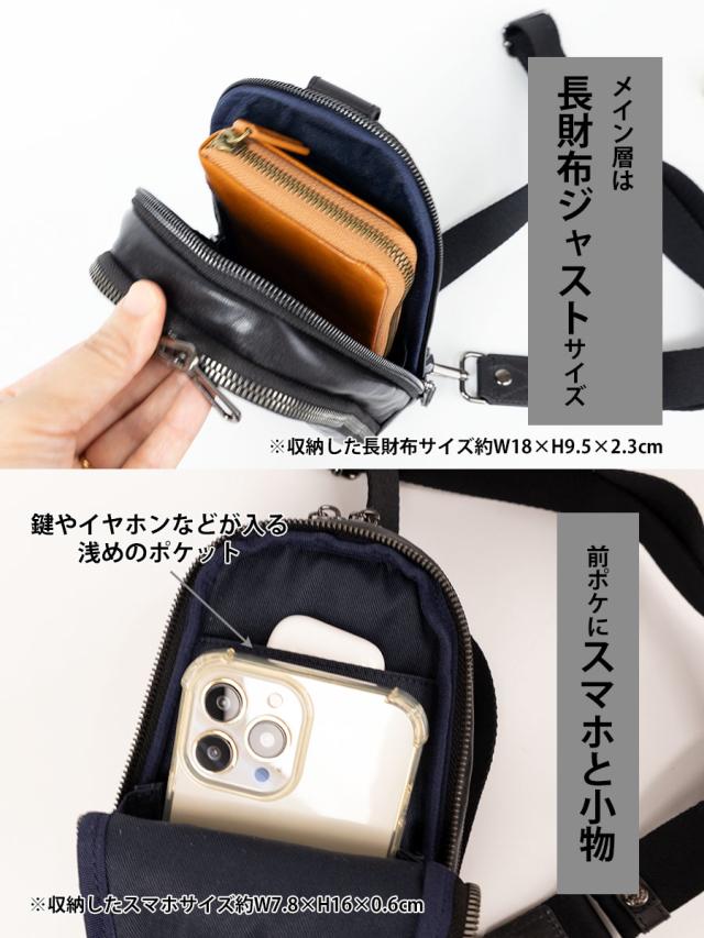 スマホと財布のみを入れるスマホショルダーサイズのボディバッグです。それだけ入ればいい、超ミニマム派用の超コンパクトサイズです。前ポケットにスマホ、メイン層に長財布を入れればほぼいっぱいになります。貴重品だけが入るサイズです。※長財布でも収納できない場合がありますのでサイズをご確認ください。