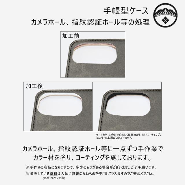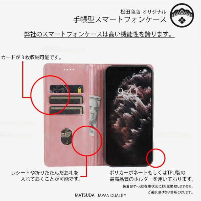 | 特徴 | 1.カメラホール ・カメラホール、指紋認証ホールなどに一点ずつ手作業で塗装し、コーティングしております。・手帳型ケースは厚みがあるため、スマホをテーブルや床おいてもレンズなどを傷つけません。 2.ケースのまま充電 ・QIワイヤレス充電に対応しておりますので、ケースのままワイヤレス充電が可能です。※機器の種類によりましては使用できません。 ・手帳型ケースを装着したまま、充電やイヤホンをすることがかのです。 ・写真撮影時にもケースをしたままお使いいただくことができます。 3.ストラップホールあり ・上側に一つストラップホールがあるので、普通ストラップ、ネックストラップやチエーンの装着が可能です。 4.カード収納 ・クレジットカード、または紙幣やレシート、定期、ポイントカード、名刺などが入れられる便利なポケット付き。 ※機種によってカード収納枚数が異なります。 ※本体の磁気の影響により、交通ICカードは使用できない場合はございます。 5.マグネット内蔵 ・マグネットが内蔵されているので、ケースをしっかりと固定することができ、バッグの中でも開く心配がありません。 6.操作簡単 ・手帳型カバーを装着したまま、イヤホンや充電などをすることが可能です。 | |||||