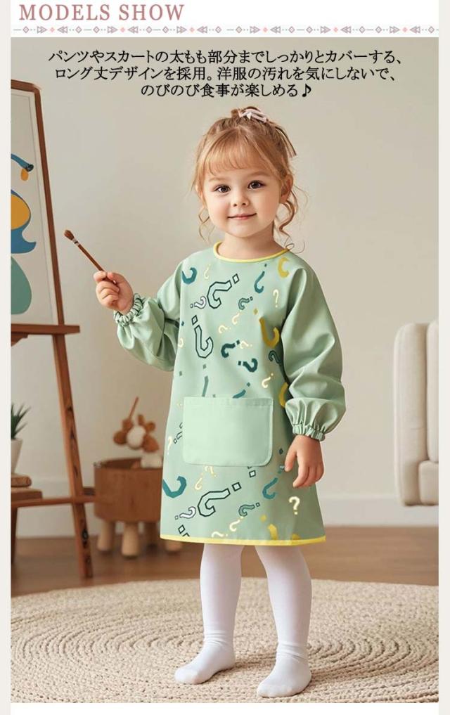 | ・食べこぼしを気にせずに、お食事タイムをもっと楽しく!キッズ用ロング丈スモックが新登場。 ・パンツやスカートの太もも部分までしっかりとカバーする、ロング丈デザインを採用。洋服の汚れを気にしないで、のびのび食事が楽しめる♪ ・キュッと絞れるゴム入りの袖口で、幼稚園や保育園でのランチタイムはもちろん、外食やよそ行きの服装の時でも大丈夫! ・スモッグ前面の幅広ポケットが食べこぼしをしっかりキャッチするから、後片付けも手間いらず。 ・生地の表面は、食べ物の汚れやドリンクの水滴をサッと弾くはっ水加工済みなので、お手入れ簡単、いつでも清潔に使えるのが嬉しいポイント! 90サイズ〜110サイズまで、お子さまの成長に合わせてチョイスできる豊富なサイズ展開も魅力。 | |