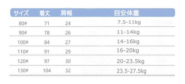 | サイズについての説明 | 【サイズ】 【80】 着丈71cm 肩幅24cm 目安体重7.5-11kg 【90】 着丈78cm 肩幅26cm 目安体重11-14kg 【100】 着丈84cm 肩幅27cm 目安体重14-16kg 【110】 着丈91cm 肩幅29cm 目安体重16-20kg 【120】 着丈97cm 肩幅30cm 目安体重20-23.5kg 【130】 着丈104cm 肩幅32cm 目安体重23.5-27.5kg ※サイズ感はスリムですので、ゆったり着たい場合はサイズアップをおすすめいたします。 ※上記サイズは平置き実寸になります。 サイズ表の実寸法は商品によって1-3cm程度の誤差がある場合がございます。 |