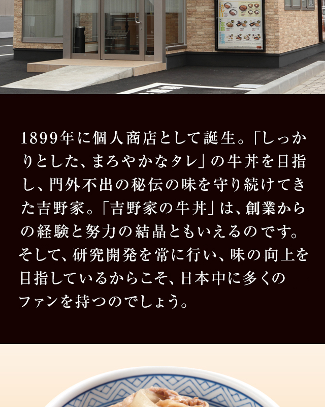 穀物肥育の北米産牛肉である「ショートプレート(バラ肉)」を使用。赤身と脂身が絶妙なバランスでマッチした、牛丼にぴったりのまろやかな肉質です。玉ねぎ本来の甘みと、深みのある味わいの秘伝のタレもこだわりのポイント。厳選した食材を使った牛丼の具です。