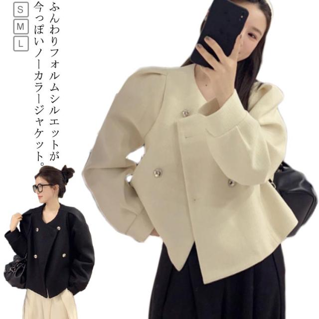ノーカラージャケット ツイードライクジャケット ピーコート パフスリーブ レディース ショート丈 アウター ツイード ジャケット キレイめ コンパクト 上着 秋ジャケット 秋冬 春服 通勤 OL 韓国ファッション 20代30代40代