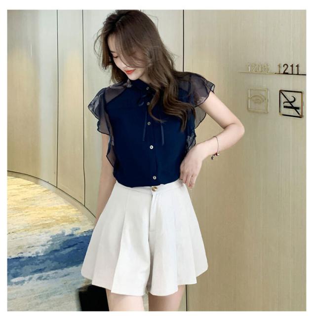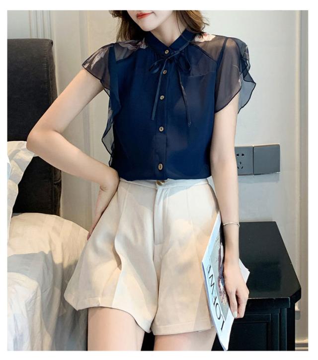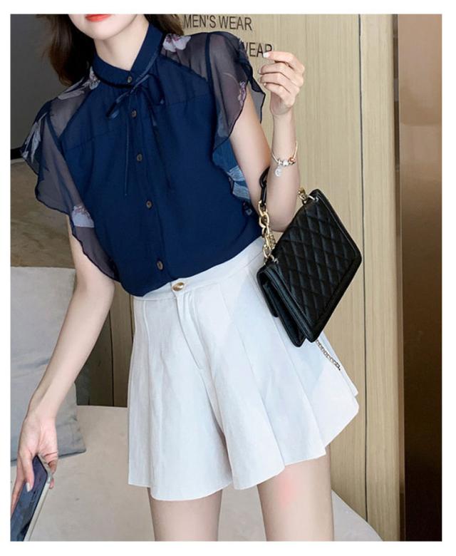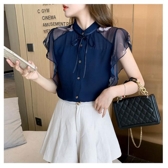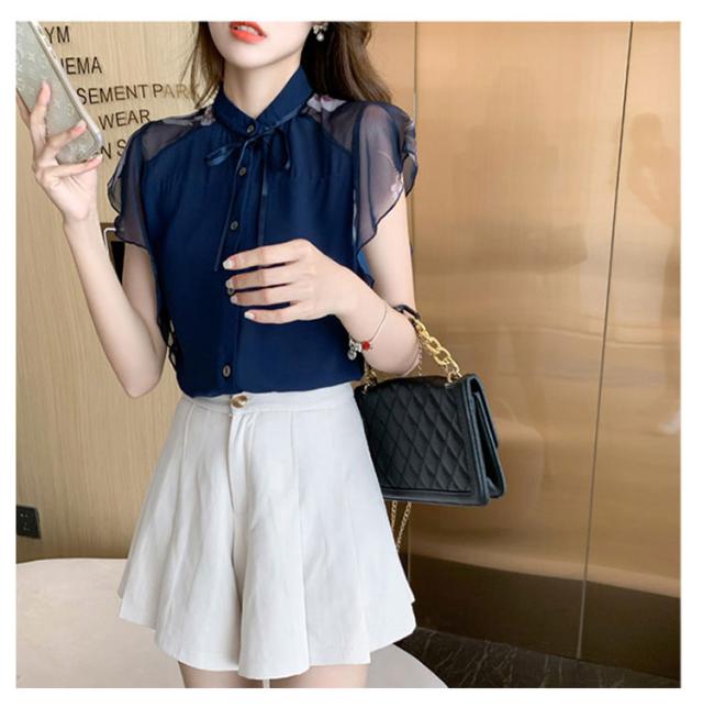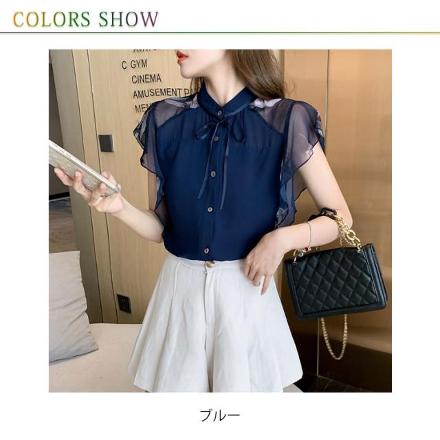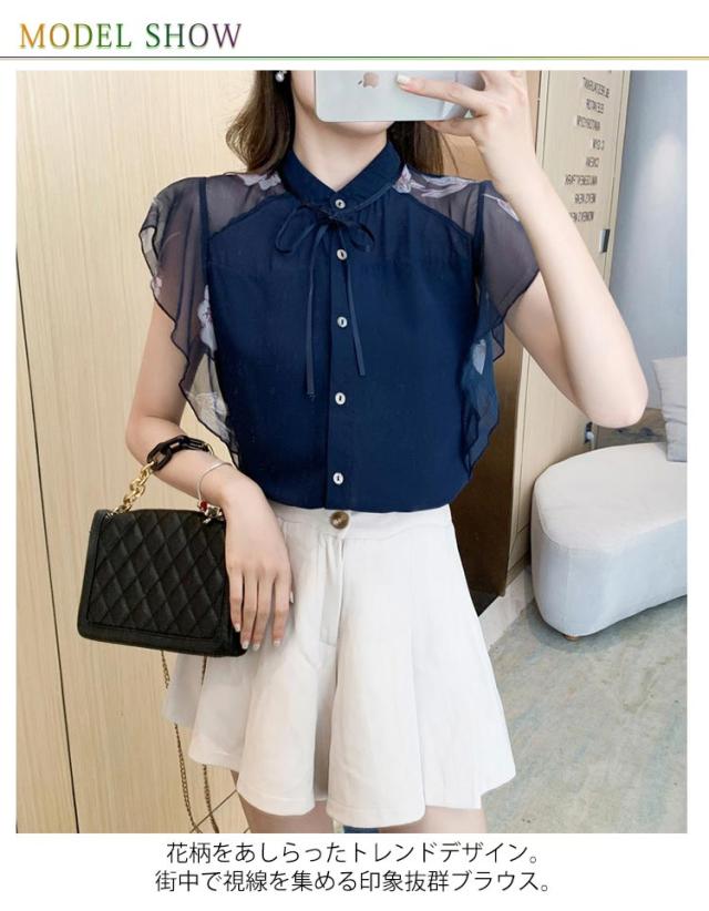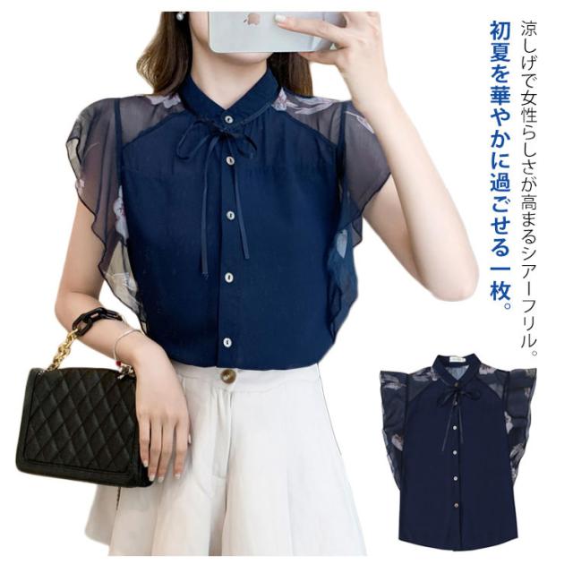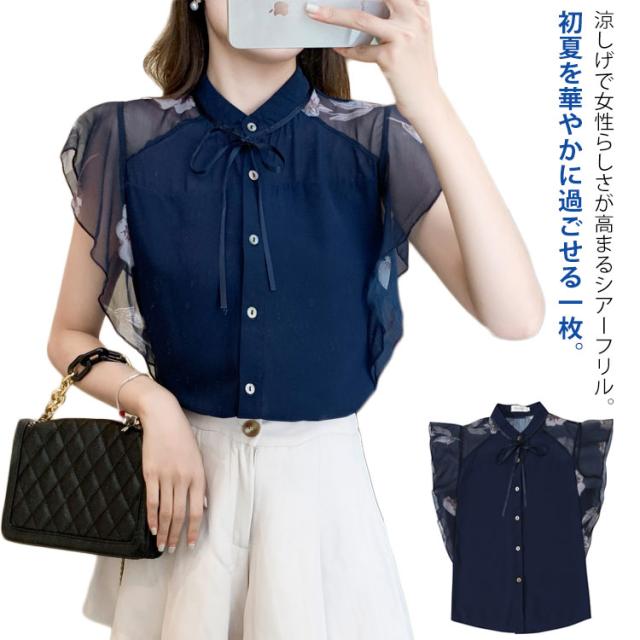 シアー ブラウス 透け袖 きれいめ トップス 半袖 花柄 シャツ フリル 半袖 春 夏 秋 かわいい 大人 清楚 ナチュラル レディース オフィスカジュアル 着回し 通勤 シンプル 体型カバー