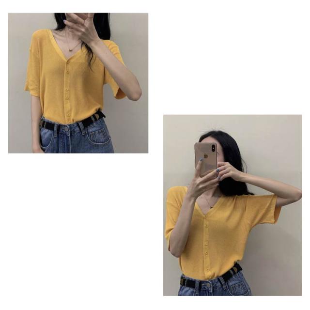 | S-3XL!可愛い半袖ニットトップス 深めのVネックが鎖骨もきれいに見せてくれます。 フロントボタン式になります。 ショート丈だから脚長効果も期待できます。 ソフトな風合いのライトニットを使用して、ストレスフリーの着心地です。 スタイリングにも取り入れやすく、お手持ちのボトムスとも好相性◎ | |