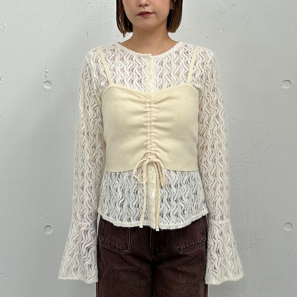 ニットビスチェは、フロントのドロストで丈感やシルエットをアレンジ可能。