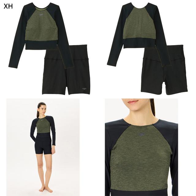 トップスはソフトなストレッチ性が特徴の環境配慮型素材「Heather Stretch ECO(ヘザー・ストレッチ・エコ)」を採用。UVプロテクト(UPF50+、紫外線カット率95%以上)機能付き。首のつまったUネック&Uバック、ロングスリーブ仕様でUV対策をしています。アクティビティに集中できる露出控えめのデザイン。差し込みタイプのカップ付きで、これ一枚で完結。着脱もカンタンです。