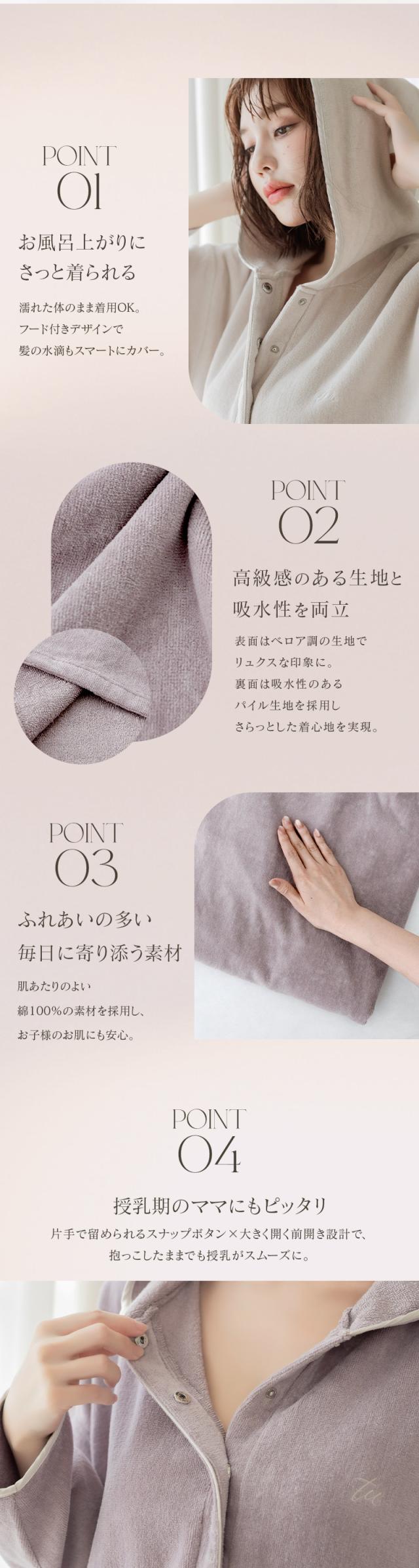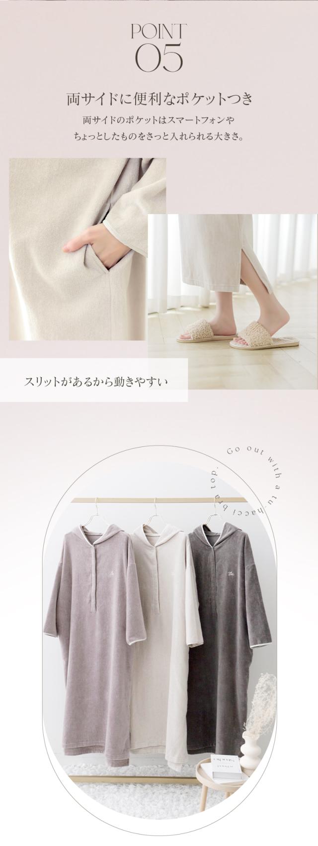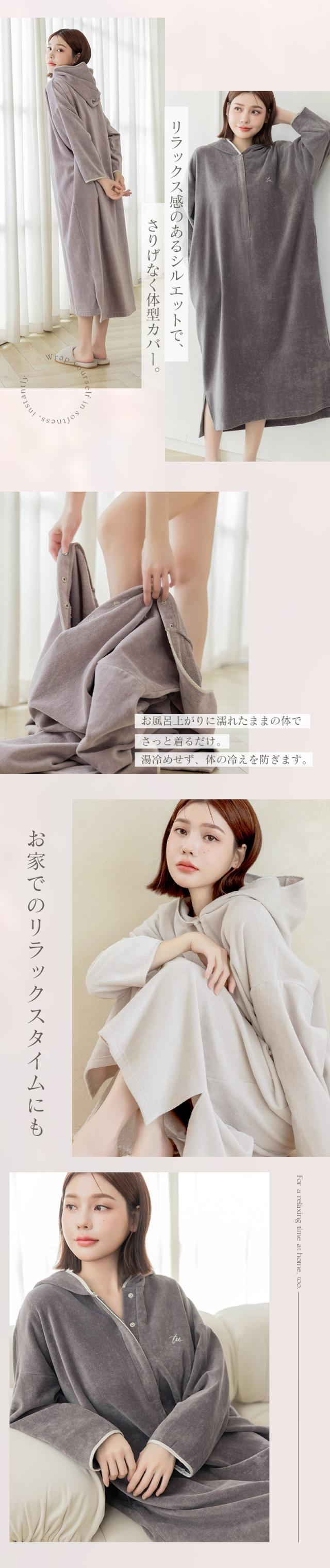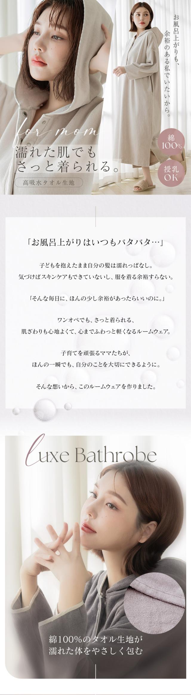 tu-hacci Outbath Collection ワンピース単品 濡れた肌でも3秒でサッと着られる!湯上がりワンピース お風呂上がりのバタバタ、こんな経験ありませんか? ・すぐに子どものお世話をしたい ・湯上がりに体が冷えやすい ・スキンケアやヘアケアをすぐに済ませたい そんな声に寄り添い、毎日をより快適に過ごせる湯上がりワンピースを開発。 高吸水タオル生地が濡れた体をやさしく包み込み、 お風呂上がりを、もっと快適に、もっと自由に。 ■こんな時におすすめ ・ワンオペ育児のお風呂上がりに、サッと着替えたい ・快適な着心地が続くので、ジムや温泉での着替えに ・秋冬のルームウェアに ・前を大きく開けるので授乳服としても 【商品の特徴】 ・裏地は汗や水滴を素早く吸収する高吸水タオル生地 ・表地はベロア調素材でリュクスな印象に ・フード付きで髪の水滴もスマートにカバー ・肌当たりの良い綿100%素材 ・片手で留められるスナップボタン×大きく開く前開き設計で赤ちゃんを抱っこしたままの授乳もスムーズに ・スマホも入るポケット付き ・スリット入りの裾で動きやすさも◎ ≫ ギフトラッピングはこちら ≪ ≫ ギフトラッピングはこちら ≪ |