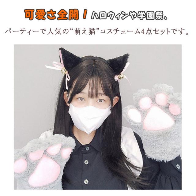 ハロウィン 猫 コスプレ レディース 女の子 4点セット 猫耳カチューシャ 蝶ネクタイ 肉球手袋 しっぽ 鈴付き リボン付き 萌え猫 ロリータ風 ねこコスチューム 黒 白 クリスマス 学園祭 パーティー