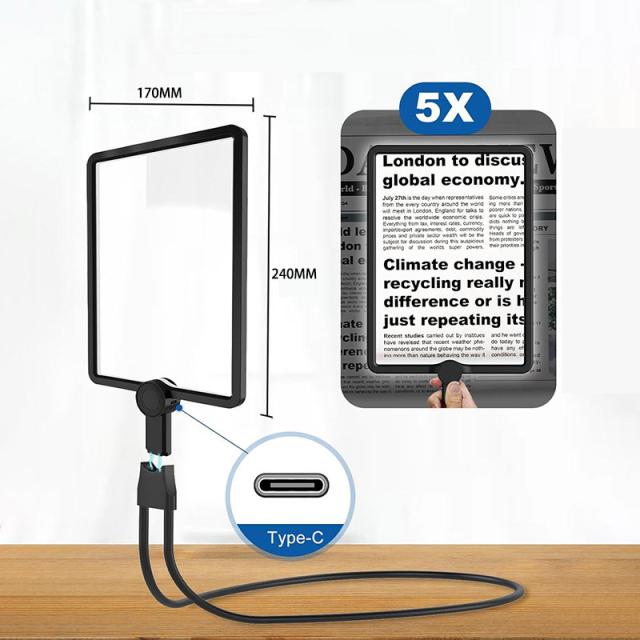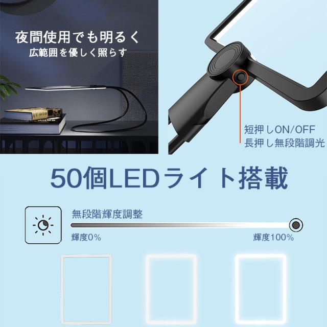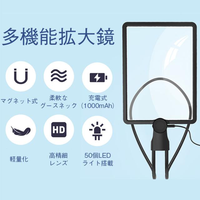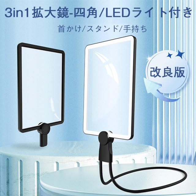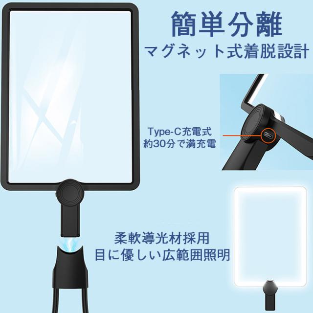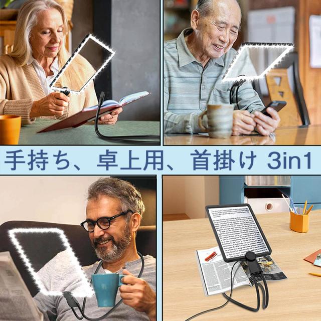 拡大鏡 ルーペ 首掛け 四角 LEDライト搭載 読書用 メガネ 手持ち 卓上型 スタンド 両手が使える 充電式 無段階調光 ハンズフリー クリアな視界