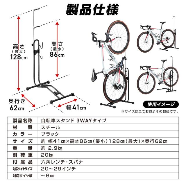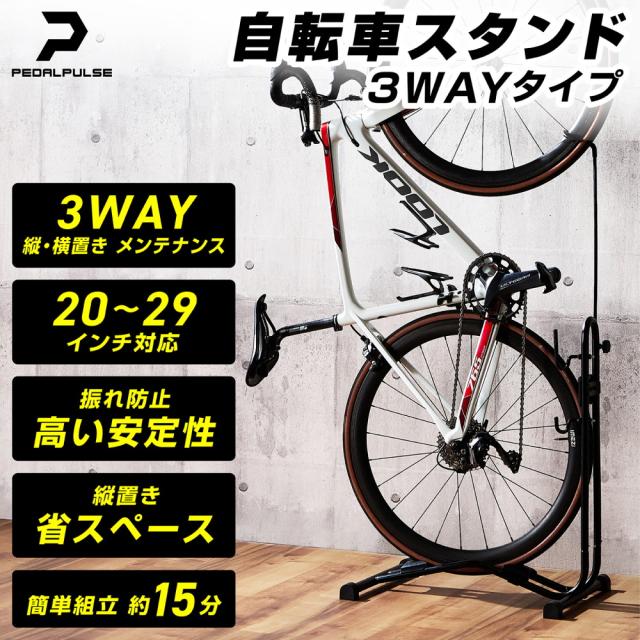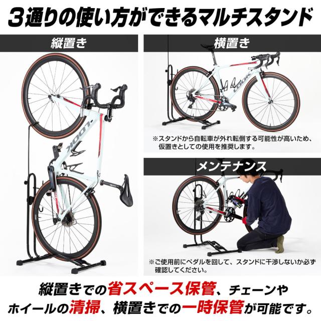 縦置き・横置き・メンテナンスの3通りで使える「自転車用スタンド 3WAYタイプ」です。