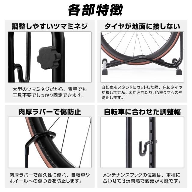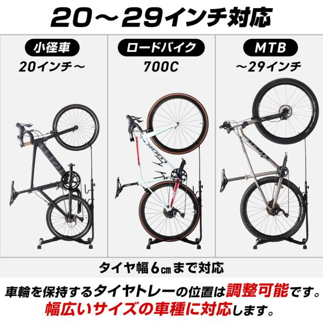 タイヤトレーの位置は調整可能。20〜29インチの自転車に対応し、小径車、ロードバイク、MTBなど様々な車種に使用できます