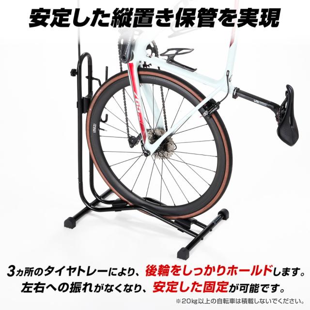 玄関や部屋の隅など限られた省スペースに縦置き設置可能。3か所のタイヤトレーで後輪をしっかりホールドし、安定した保管を実現します