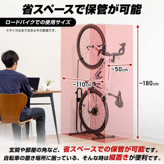 玄関や部屋の隅など限られたスペースでも自転車を縦置きでき、収納効率がアップします