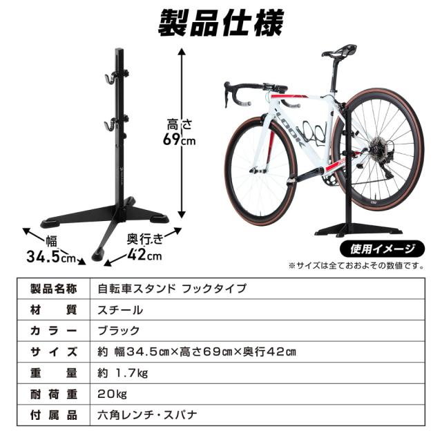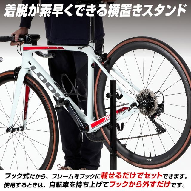 フレームをフックに載せるだけで簡単に着脱できる「自転車用スタンド フックタイプ」です。