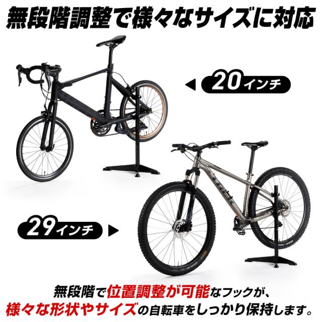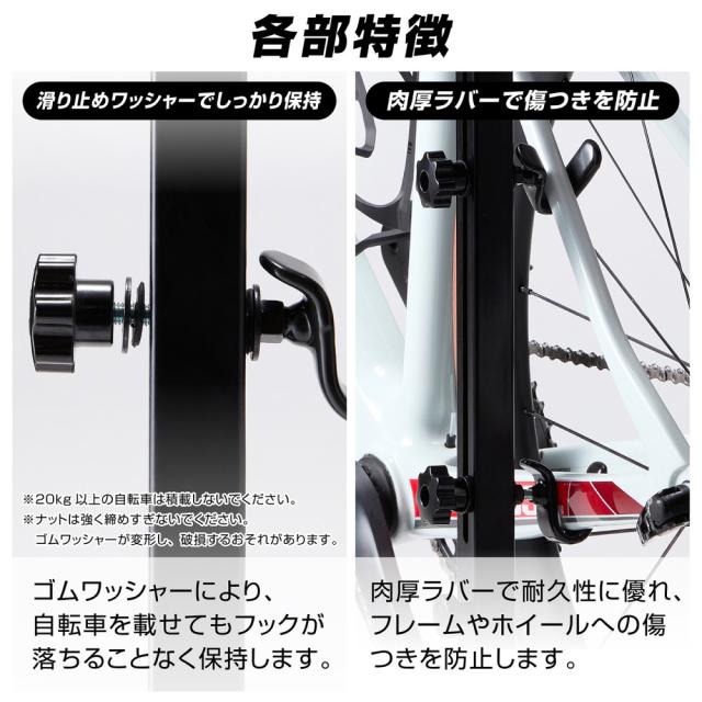 無段階で位置調整が可能なフックにより、様々な形状やサイズの自転車をしっかりと保持します