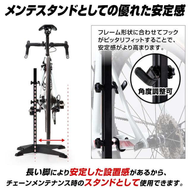 長い脚による安定感で、チェーンやホイール清掃・調整作業にも最適です。 ※耐荷重20kgまで