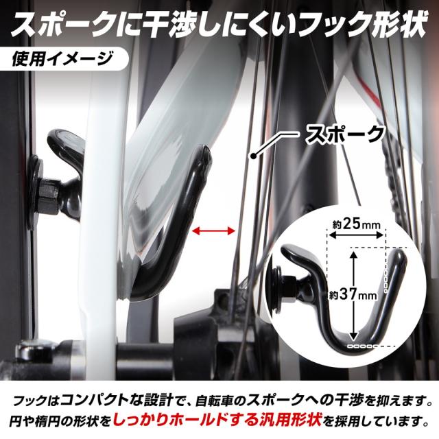 【スポークに干渉しにくいフック形状】コンパクト設計のフックが、スポークとの干渉を抑えます。また、円や楕円の形状をしっかりホールドする汎用形状を採用しています