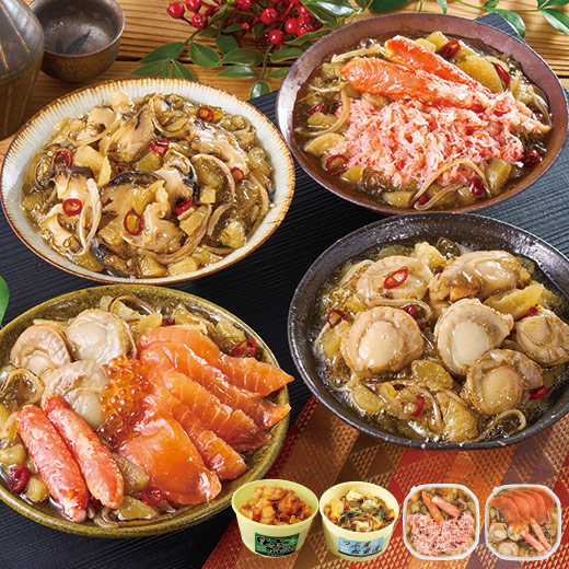 お届け内容:●つぶ貝松前漬400g、ほたて松前漬400g、豪華海鮮松前漬400g、かに松前漬400g