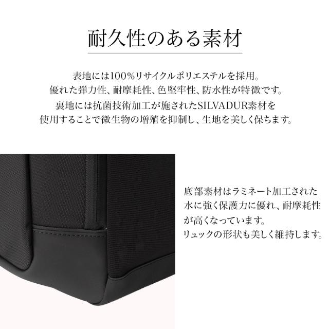 | 移動時の必需品をスタイリッシュに保護 高品質で信頼性の高いアルトモント モダン デラックス バックパックなら、安心して荷物を収納して移動できます。再生ポリエステル(rPET)を使用し、抗菌裏地とラミネート加工を施した底部を備えたバックパックは、防水性を備え、薄暗い状況での視認性を高める光反射のディテールが施されています。通勤や仕事の後の移動に必要な物をすべて整理収納して、簡単にアクセスできます。取り外し可能なラップトップスリーブと内側のトリプルコンパートメント(サウンドポケット、ビジネス用整理機能、キーフック、レザープル付きのジッパー式ポケット、傷防止加工を施したパッド入りコンパートメントなど)で必需品が安全に保護されるので安心です。パススルー式トロリースリーブを使用してラゲッジを効率的に使えるほか、調節可能なスターナムストラップで重量バランスを快適に整えられます。 |