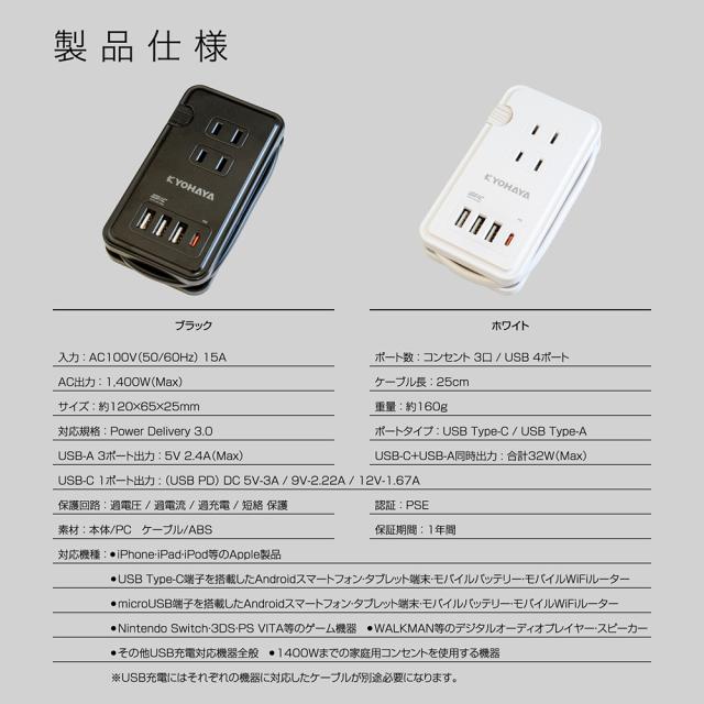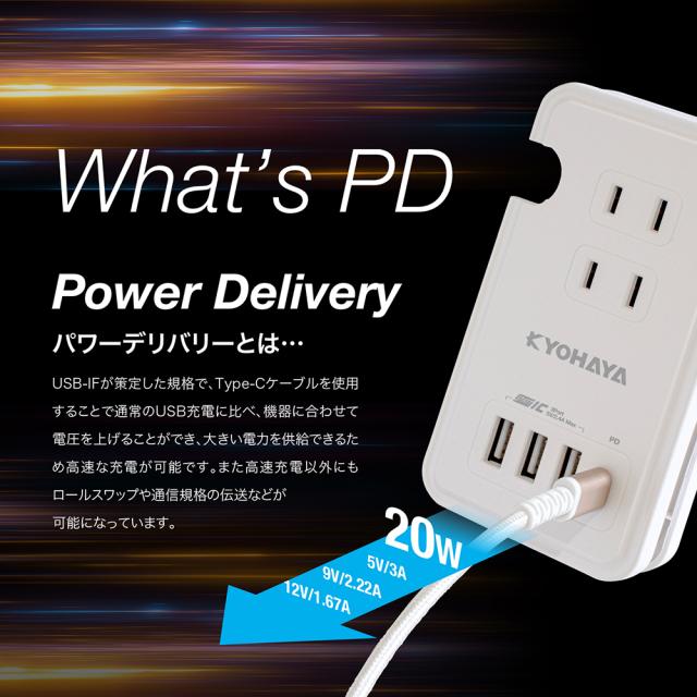 | 商品名 | USB充電器 コンセント タップ 急速 充電器 Cアダプタ 電源タップ PD 20W POWER DELIVERY スマートIC 搭載 USB出力合計32W コンセント最大1400W コード長25CM iPhone スマホ ANDROID KYOHAYA RTTP32PD |