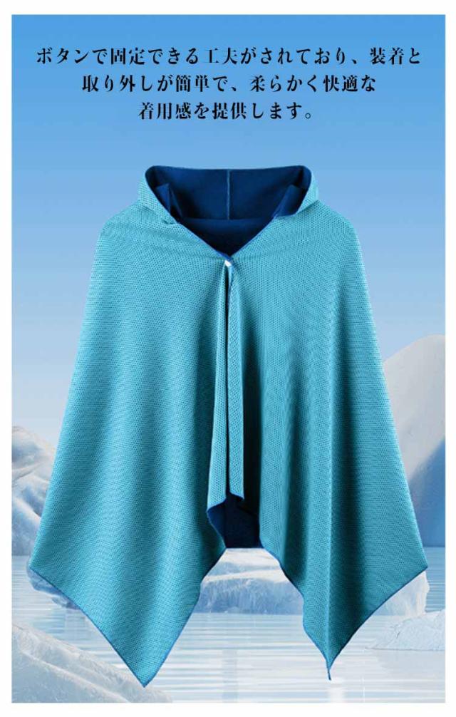 | 水に濡らして振るだけでひんやり気持ちいい!革新的なクールポンチョが登場しました。 この大判サイズの冷感タオルは、体を広範囲にカバーすることができるため、熱中症対策にも最適です。 ボタンで固定できる工夫がされており、装着と取り外しが簡単で、柔らかく快適な着用感を提供します。 炎天下が避けられない状況の仕事や作業、待機時間の長い部活、スポーツ観戦、フェスなど様々なシーンで活躍します。 カラーバリエーションは9色と豊富で、お好みや用途に合わせて選べます。 | |
