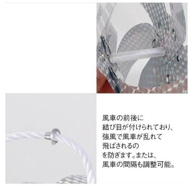 | アウトドア用の鳥除け回転タイプの風車. 太陽光を強く反射することで鳥を脅かして寄せ付けません! 鳥よけはシンプルなデザインを採用しておりますので、外観の雰囲気を損なうことなくインテリアの一つとしてご使用いただけます。 太くて厚手のナイロンロープは、高強度あり、優れた摩耗抵抗力と引裂き耐性を備えています。 風車の前後に結び目が付けられており、強風で風車が乱れて飛ばされるのを防ぎます。または、風車の間隔も調整可能。 簡易に設定でき、お庭、果樹園、池、公園、プール、畑などの様々な場所が利用できます。 | |