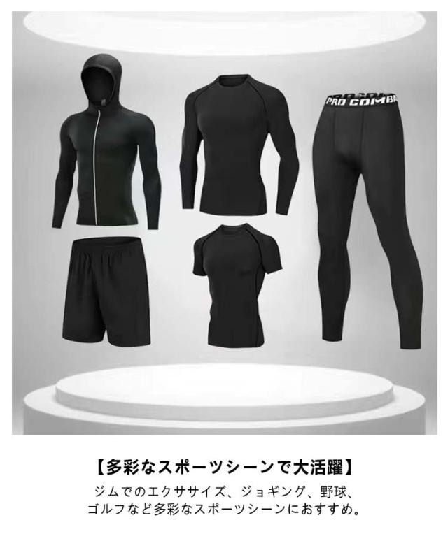 | 快適スポーツウェア上下5点セット 吸汗/速乾/ストレッチ 反射材入り M-4XL 半袖シャツ・長袖シャツ・パーカー・ショートパンツ・レギンスの5点セットのスポーツウェア。 組み合わせ自在で、1年を通して便利にお使い頂けます。 モノトーンを基調にしたおしゃれでスタイリッシュなデザインも魅力。 豊富なバリエーションで、お好みのデザインをお選び頂けます。 【伸縮性に優れたコンプレッションウェア】 伸縮性の高いストレッチ素材を採用。 身体に圧をかけることで、さまざまなサポート効果をもたらす機能性ウェアです。 どんな動きにも自然にフィットし、使用感抜群です。 【反射機能付きで安全!】 特殊な反射ロゴにより、夜道や大雨の時は後ろの車から発見しやすく安心安全です。 【通気性、吸水性・速乾性抜群】 メッシュ素材で通気性も◎ 吸水性、速乾性にも優れ、汗をかいても快適にご着用頂けます。 また、お洗濯しても乾きやすいのも嬉しいポイントです。 【多彩なスポーツシーンで大活躍】 ジムでのエクササイズ、ジョギング、野球、ゴルフなど多彩なスポーツシーンにおすすめ。 機能性とデザイン性を兼ね備えたうれしいアイテムなので、大切な方へのプレゼントにも最適です。 | |