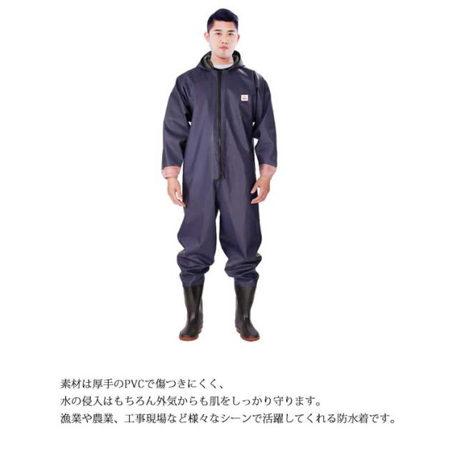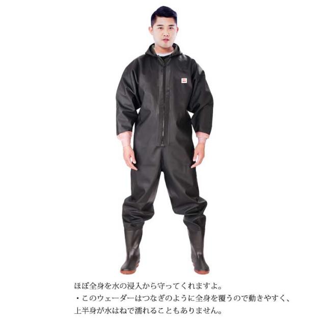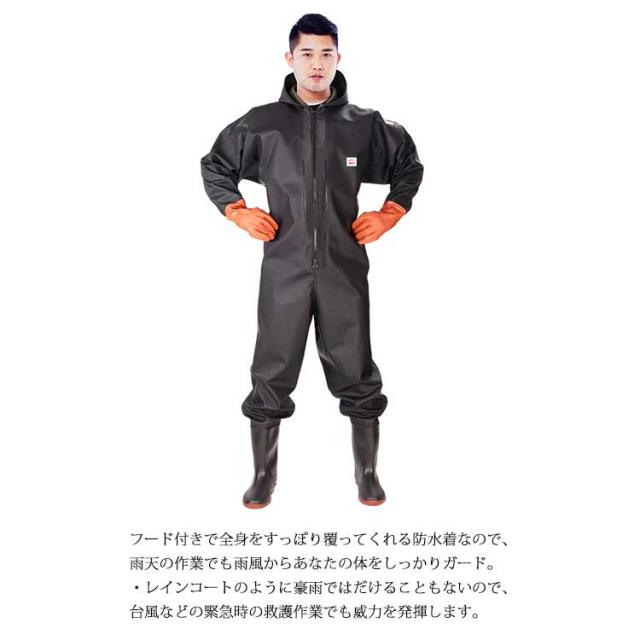 | ・首元まで防水してくれるウェーディング用スーツです。 ・ほぼ全身を水の浸入から守ってくれますよ。 ・このウェーダーはつなぎのように全身を覆うので動きやすく、上半身が水はねで濡れることもありません。 ・フード付きで全身をすっぽり覆ってくれる防水着なので、雨天の作業でも雨風からあなたの体をしっかりガード。 ・レインコートのように豪雨ではだけることもないので、台風などの緊急時の救護作業でも威力を発揮します。 ・素材は厚手のPVCで傷つきにくく、水の侵入はもちろん外気からも肌をしっかり守ります。 ・胸ファスナーも水の侵入を防ぐ仕様で、さらにその下にも防水布を装備。 ・靴底も滑り止めの着いた弾力素材なので履き心地もGood。 ・全体を立体成型しているので動きやすさもバッチリです。 ・漁業や農業、工事現場など様々なシーンで活躍してくれる防水着です。 | |