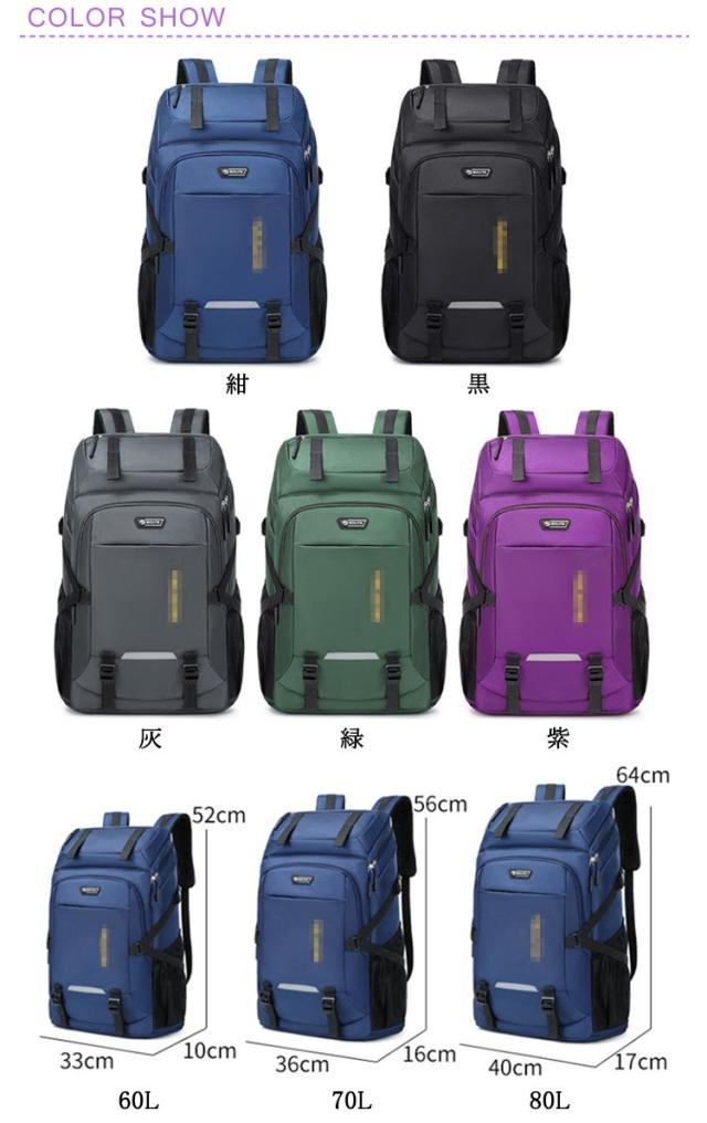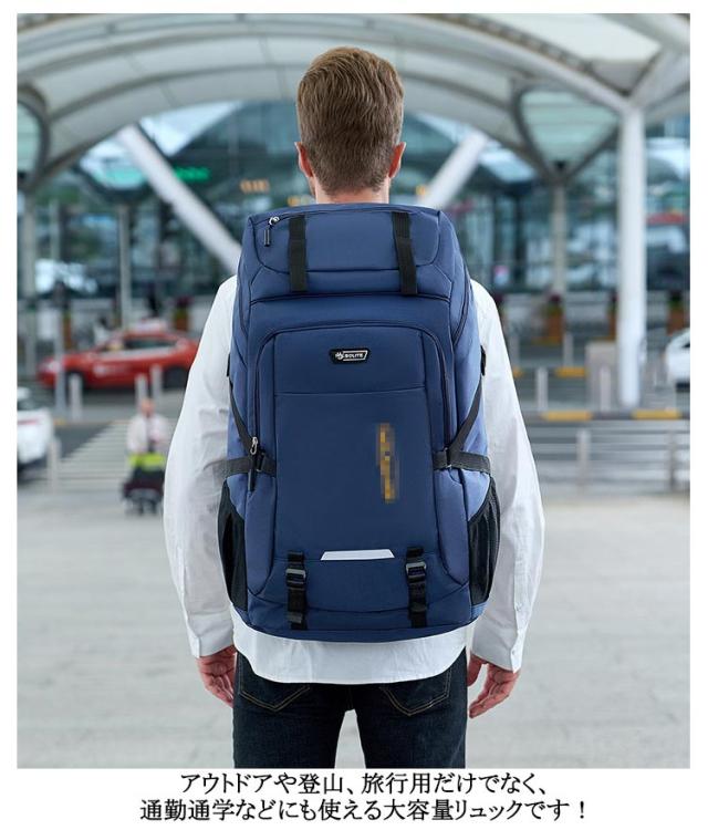 | 60L 70L 80L 撥水オックスフォード 大きな荷物があっても安心、靴からPC、衣類や小物を全て収納できる圧巻の大容量 ウエストベルトとチェストベルトの2つのベルトで安定的にリュックを体に固定 補強したショルダーストラップで耐荷重性能が高く耐久性があり重い荷物をもってもほつれや破れに強くなっています。 背面にはメッシュ素材の通気クッションを採用。通気性が良く、 汗などの水分を速やかに吸収・拡散させ、快適な使用感を実現します。 撥水加工がされた防水のリュックサック多少の雨であれば水を弾く撥水性。 アウトドアや登山、旅行用だけでなく、通勤通学などにも使える大容量リュックです! | |