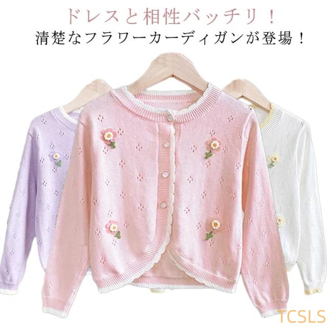 | ドレスと相性バッチリ!清楚なフラワーカーディガンが登場! ドレスに一枚合わせるだけで全体の雰囲気もグレードアップします。 キッズスーツやフォーマルワンピースと合わせて卒園式や入学式に、夏の冷房対策用もお勧めます。 可愛らしさいっぱいのキッズカーディガン、春夏秋にぴったりです。 結婚式やピアノの発表会、卒業式などのフォーマルシーンにはもちろんロリィタ系・ガーリー系のコーディネートにもおすすめ。 | |