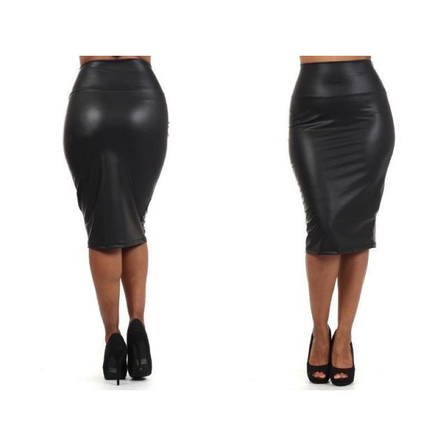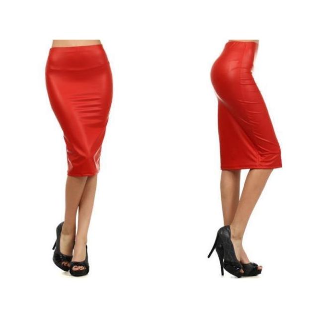 タイトスカート フェイクレザー レディース ハイウエスト 膝丈 膝下 ボトムス 無地 シンプル スリム 美脚 脚長効果 セクシー ブラック レッド 女